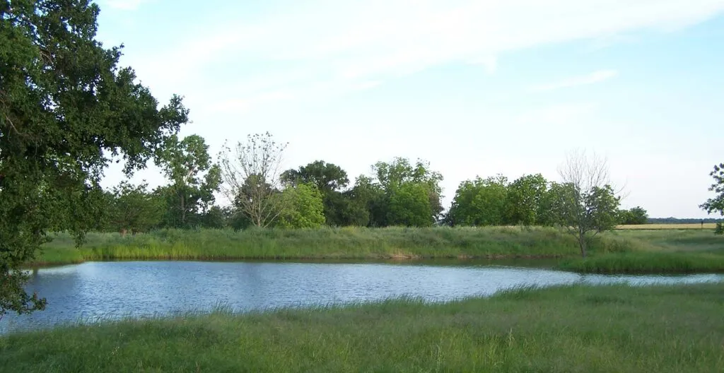 Pond with trees and grass in Hillsboro, West, Hill County, Texas.