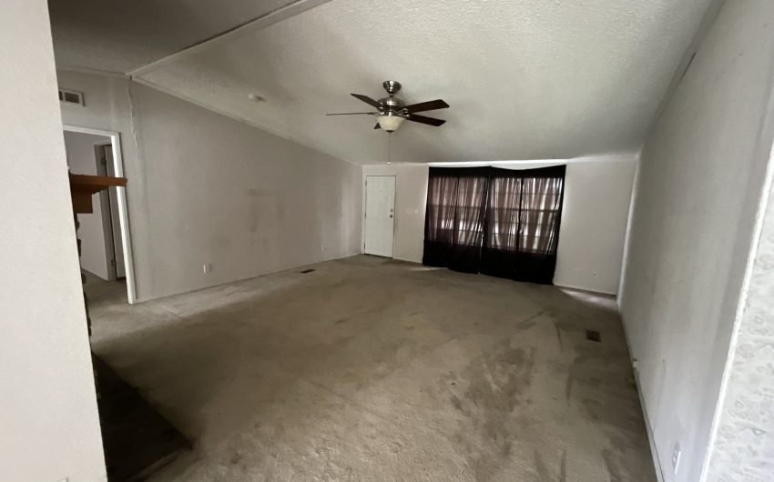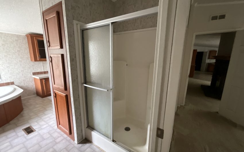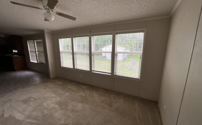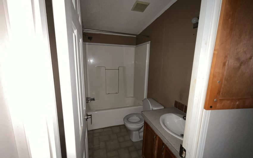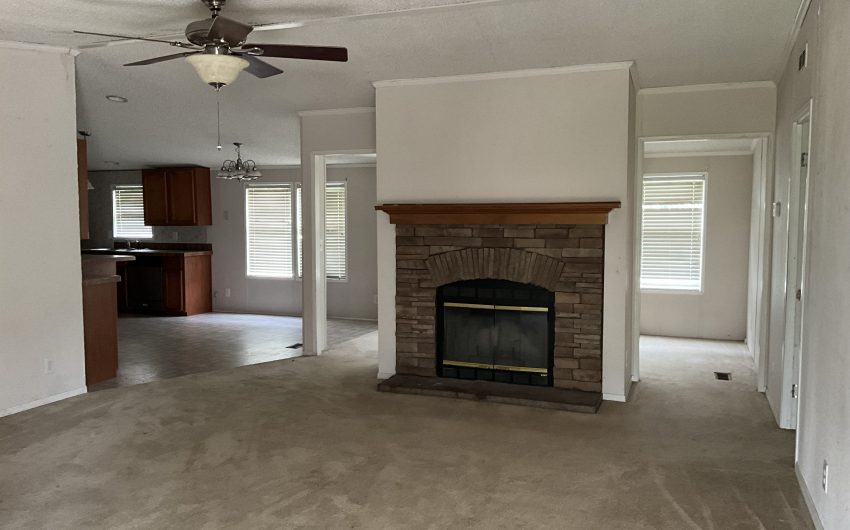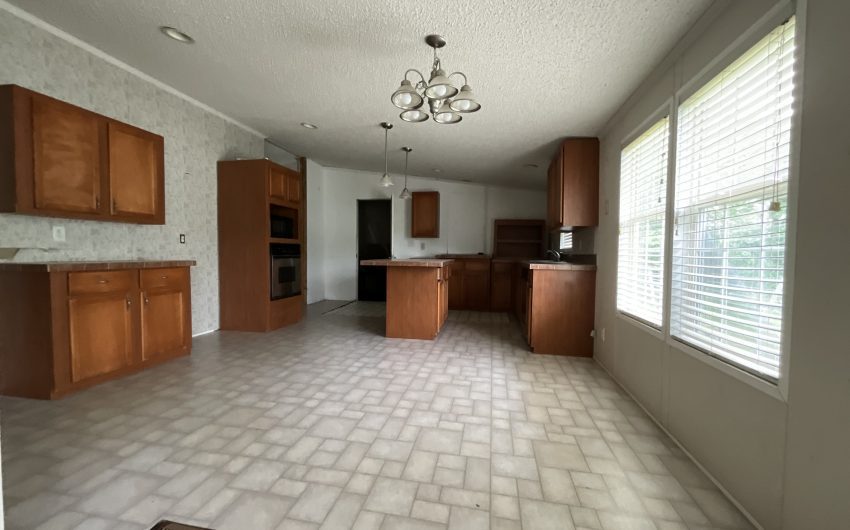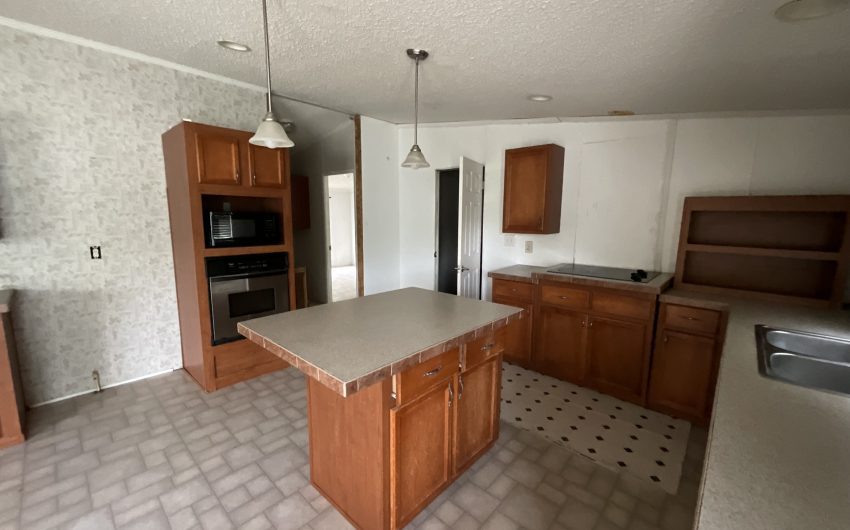 SOLD. New in Bynum. 2003 doublewide with 1794 sq. feet on a corner lot is available. This property is walking distance to the school, on a corner lot, and there is a vacant lot in front of the home. Several beautiful trees and a storage building in the back along with off street parking. Home has 3 bedrooms and 2 full baths with a large living area with a wood burning fireplace. The open kitchen has an island, built in oven and microwave, dishwasher, and electric stovetop. The dining room has windows facing the backyard to the south. Home needs a little TLC, so only cash or conventional buyers.